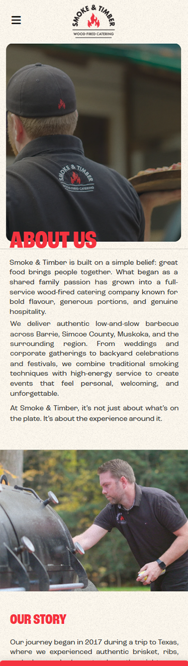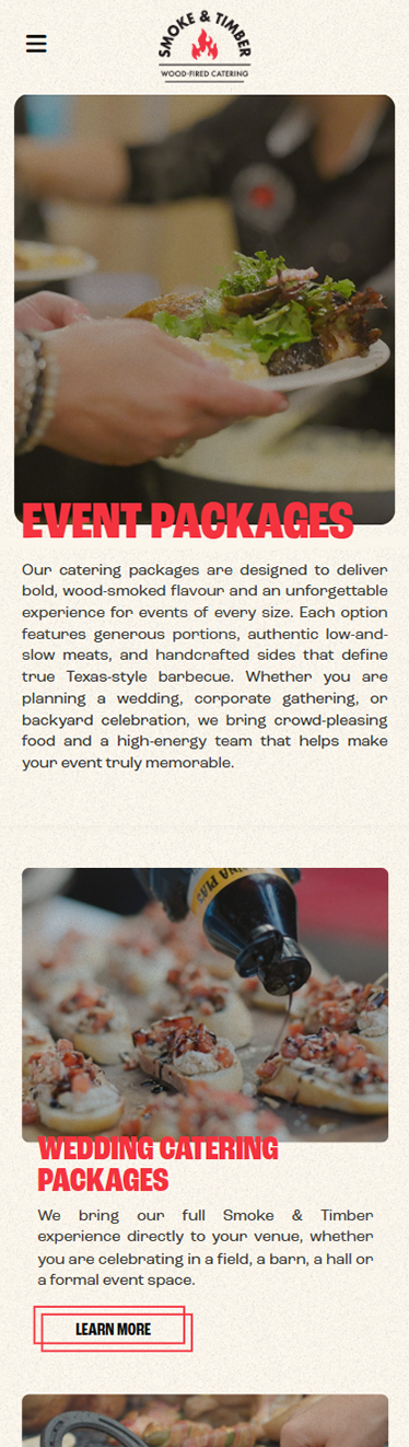 Smoke & Timber had a clear voice, a great product, and a growing reputation — they needed a website that could carry all of that into a first impression. The work focused on building something warm, appetizing, and easy to act on: organizing catering packages and menu options in a way that helps couples, event planners, and hosts quickly understand what's possible, writing copy that captures the personality of a family business without losing the credibility of a professional one, and designing an experience that makes every visitor feel hungry before they even scroll.