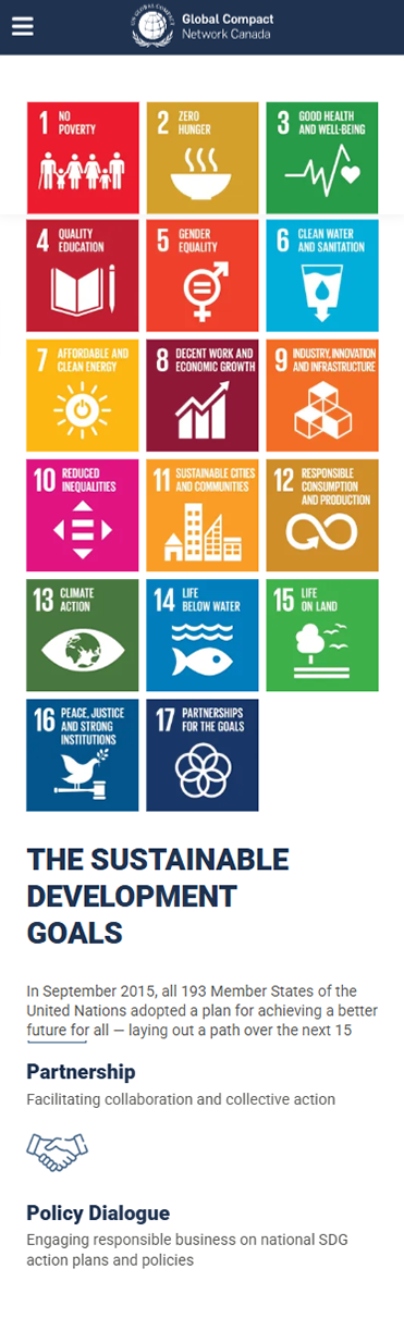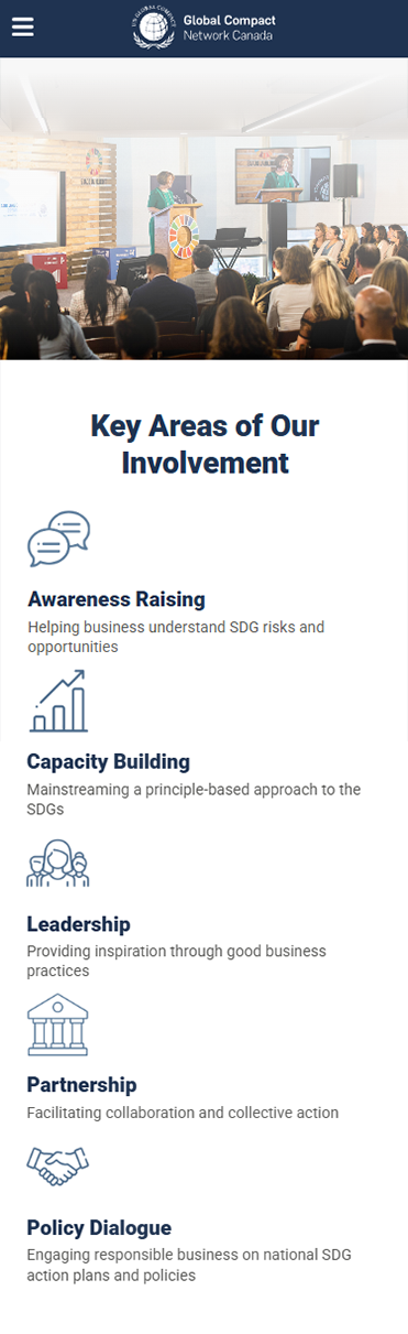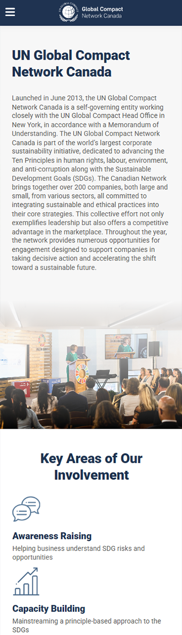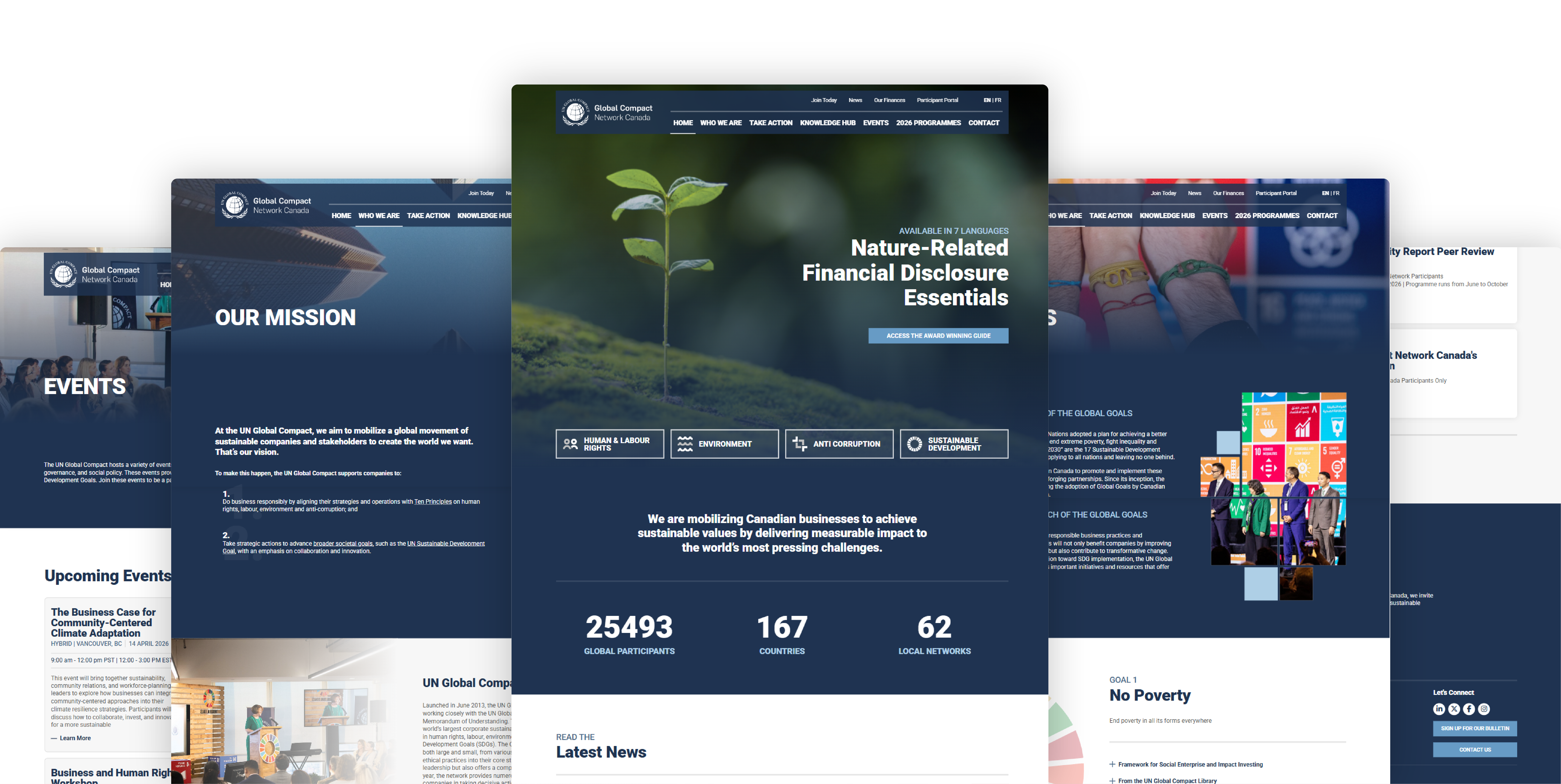 The UN Global Compact Network Canada needed a web presence that could serve a sophisticated, multi-stakeholder audience — corporate executives, policy advocates, partner organizations, and businesses exploring membership — without feeling like a typical government or NGO site. The work focused on bringing clarity and gravitas to a complex content ecosystem: organizing programming, resources, news, and membership information into a clean, credible experience that reflects the organization's international standing while remaining approachable for Canadian businesses at every stage of their sustainability journey. The site needed to feel as purposeful as the network itself.