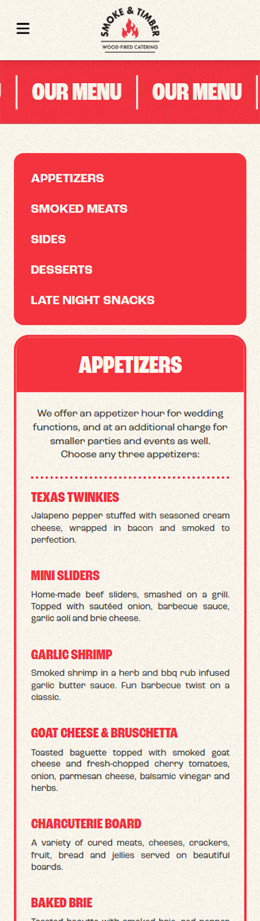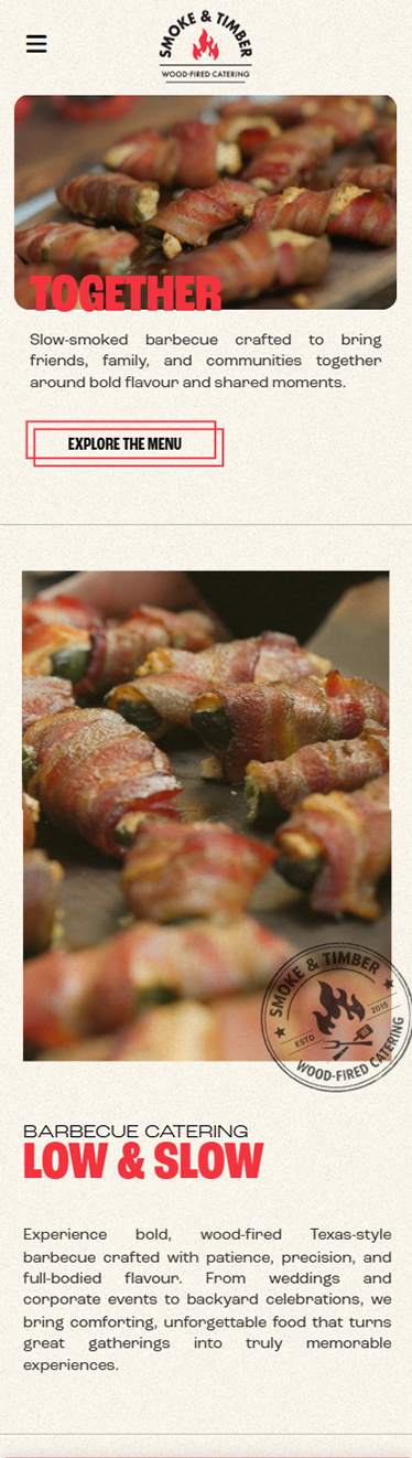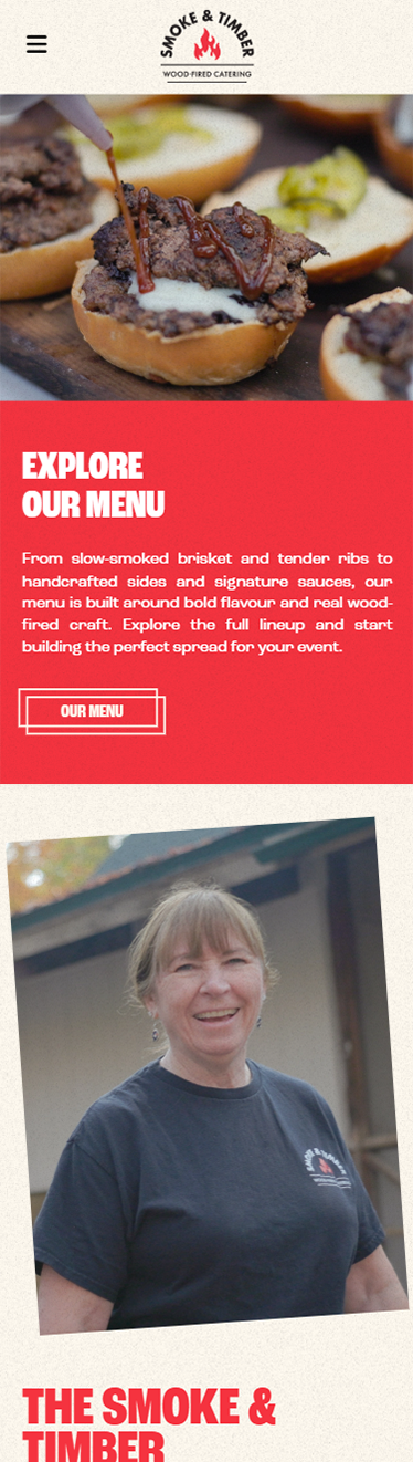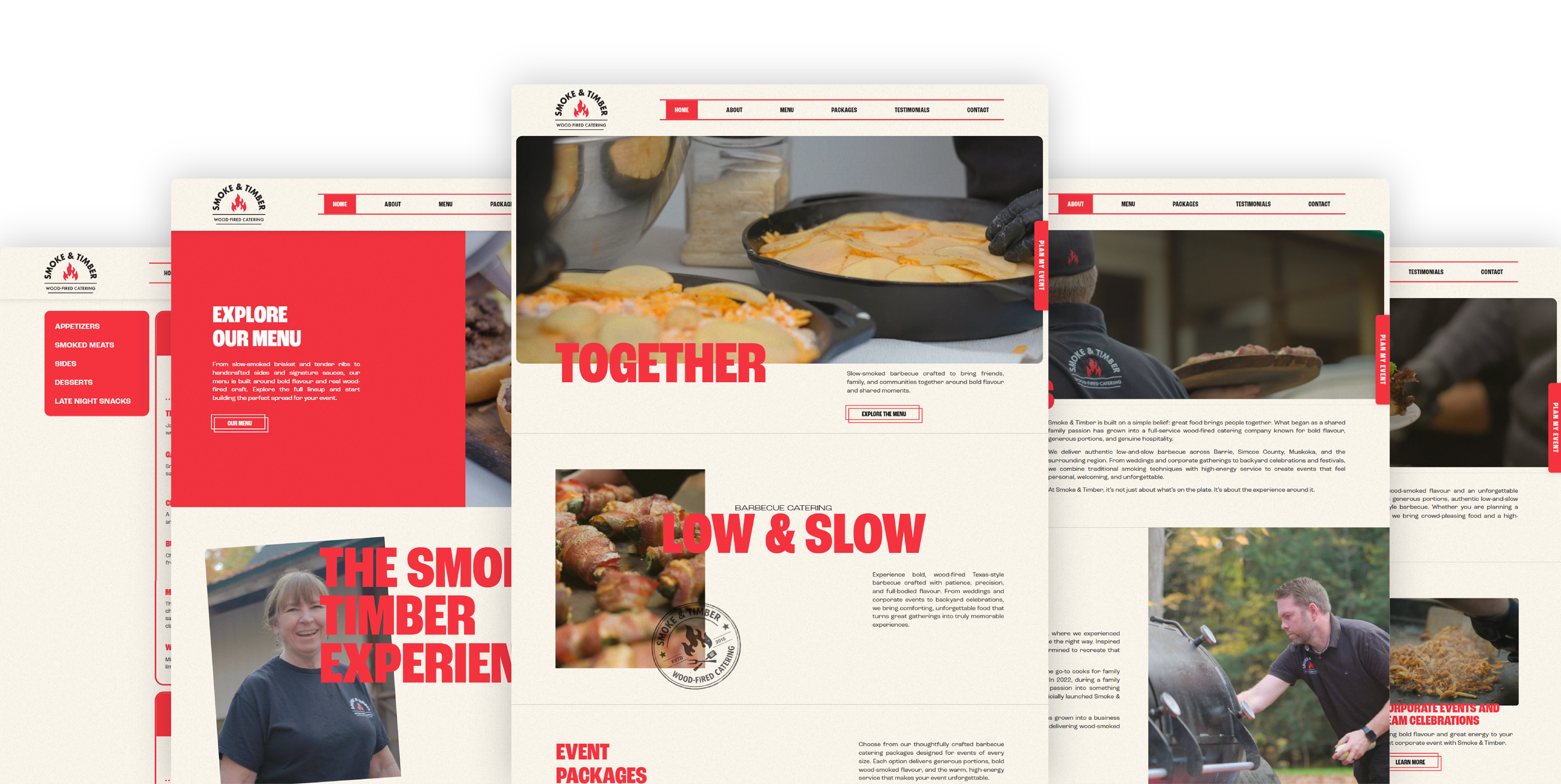 Smoke & Timber had a clear voice, a great product, and a growing reputation — they needed a website that could carry all of that into a first impression. The work focused on building something warm, appetizing, and easy to act on: organizing catering packages and menu options in a way that helps couples, event planners, and hosts quickly understand what's possible, writing copy that captures the personality of a family business without losing the credibility of a professional one, and designing an experience that makes every visitor feel hungry before they even scroll.