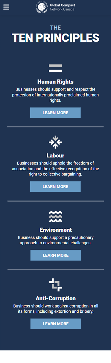 Launched in 2015, the UN Global Compact Network Canada is a self-governing entity working closely with the UN Global Compact's head office in New York, dedicated to advancing the Ten Principles in human rights, labour, environment, and anti-corruption alongside the Sustainable Development Goals. The Canadian network brings together over 200 companies of all sizes and sectors, supporting them in embedding sustainable and ethical practices into their core business strategies — and making the case that responsible business is also good business.
